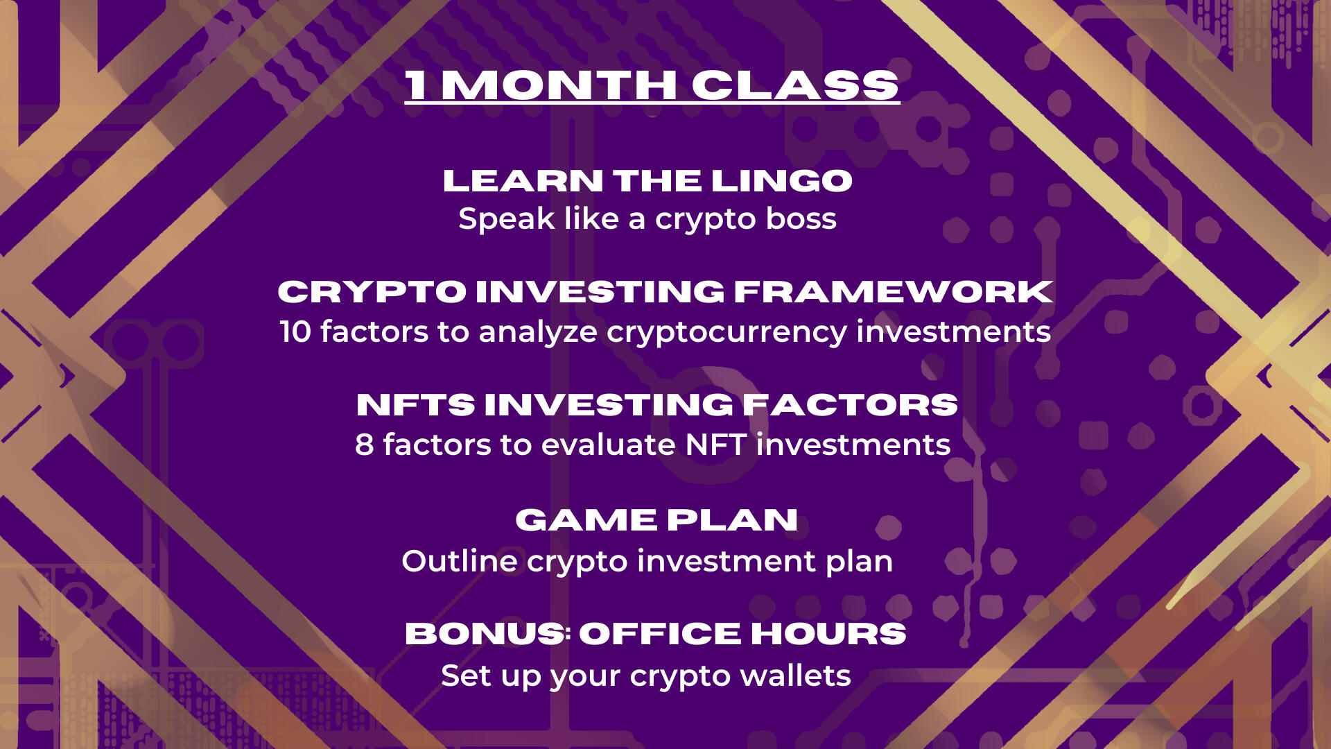 We'll be teaching the fundamentals of Crypto, Blockchain, and Web3. Drop in the first class for free.